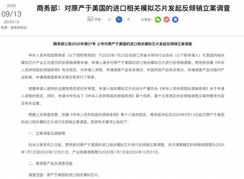 第一个是对美国模拟芯片产业进行反倾销调查,申请调查期内,原产美国的产品价格大幅下降,对华出口倾销幅度超300%,占中国市场份额年均达41%。