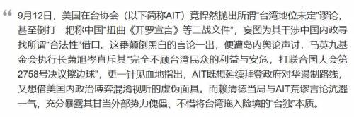 仅隔了一天,美国“在台协会”大放厥词,声称“台湾地区归属于哪里目前还尚未确定,《波茨坦公告》中关于台湾地区的定位是错误的”,这是公然否认一个中国原则,其严重性不言而喻。