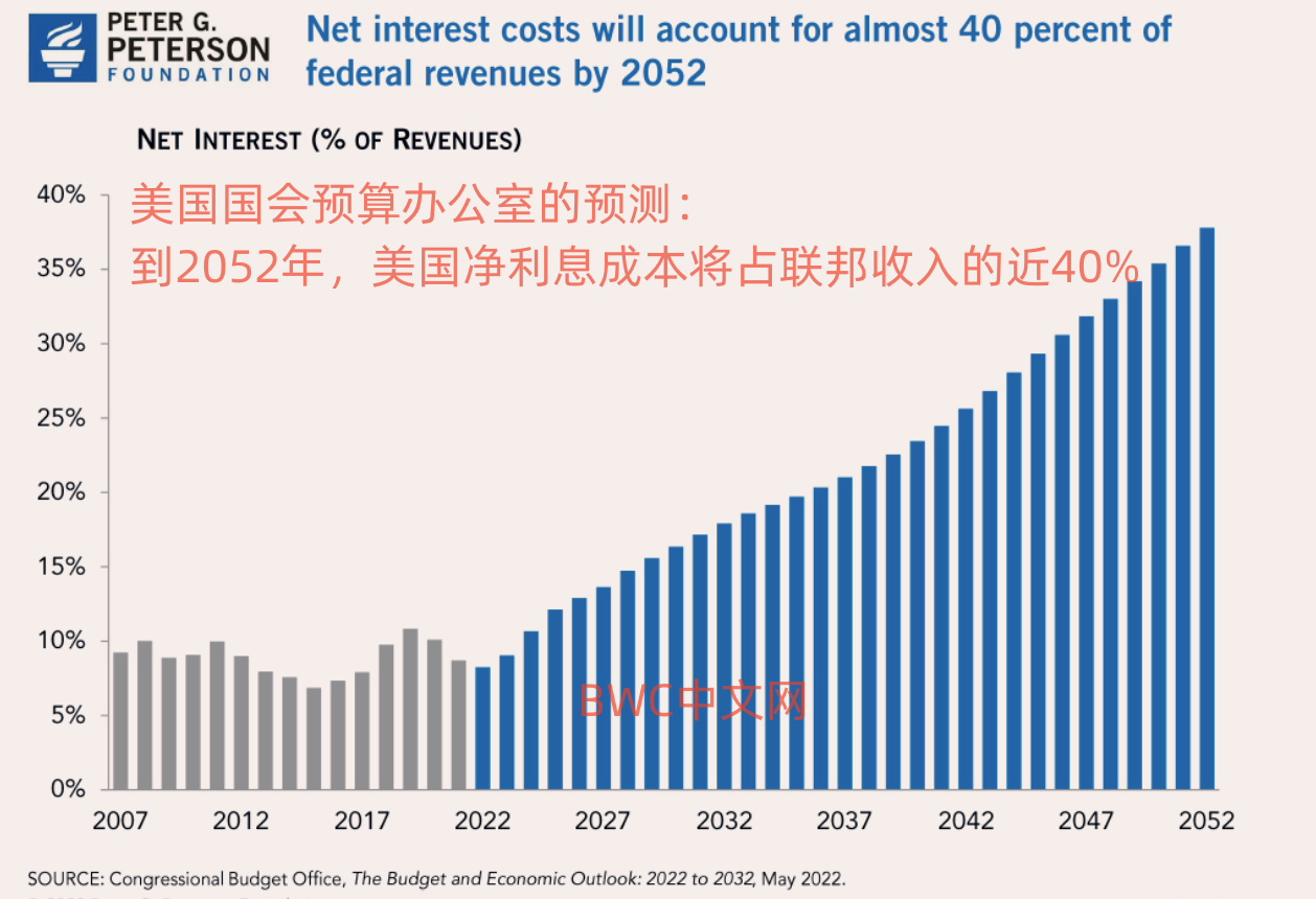 如果美国债务在2024年底达到38万亿美元,那将意味着美国每年为此支付的利息将达到惊人的2万亿美元,美国国会预算办公室在1月5日的最新债务预测表明,美国联邦债务负担将在2052年达到GDp的185%,美国债务将达到50万亿美元,其中,债务利息成本增加最快,然后呈指数级增长,直到美元最终崩溃。所以,仅从这个角度来看,美联储加息和维持高利率的行为,最终的结果将会引爆全球最大庞氏核弹,使美国的债务经济破产。