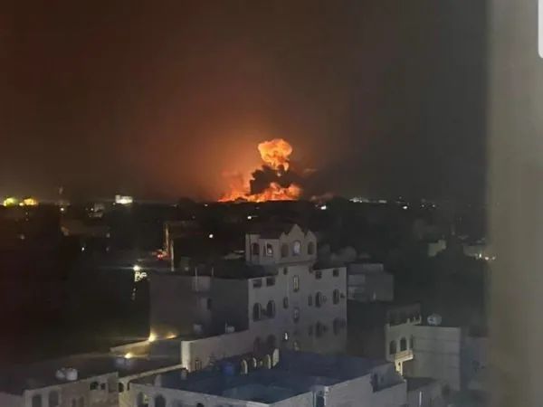 当地时间1月12日凌晨,在也门首都萨那拍摄的空袭画面。图源:新华社。