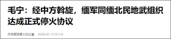 在1月12日的中国外交部记者会上,外交部发言人毛宁回答记者提问时表示,1月10日至11日,在中方斡旋和促推下,缅军同缅北民地武组织达成正式停火协议,双方同意立即停火止战,军事人员脱离接触,相关争端和诉求通过和平谈判方式解决。