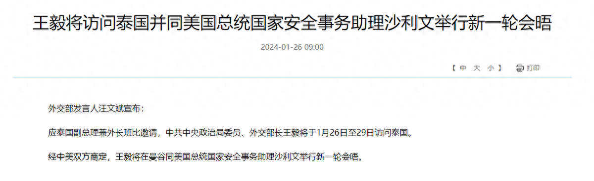 外交部日前宣布,王毅外长将对泰国进行为期三天的访问,与此同时,经中美双方商定,王毅外长访问曼谷期间,将与美国总统国家安全顾问沙利文举行新一轮的“王沙会”。