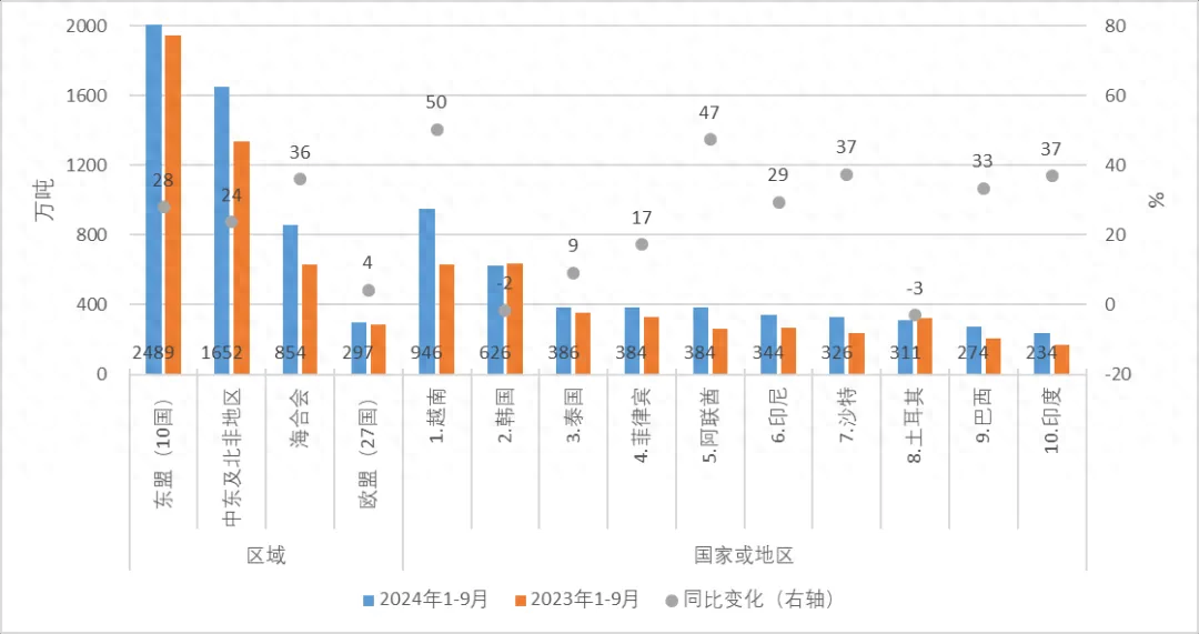 数据显示,1-9月,我国对东盟国家出口2488.8万吨,同比增长28.1%,其中对越南出口946.3万吨,同比增加316.9万吨,增长50.3%。对海合会国家出口854.2万吨,同比增加226.3万吨,增长36.0%。此外,对南部非洲关税同盟(SACU)出口增长也很明显,同比增长50.1%。