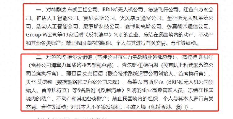12月5日,据环球网报道,中国严厉惩罚美国,对13家美国军工企业以及6名高管实施制裁,根据相关内容,中方将冻结反制清单上的实体及个人,在中国境内的一切资产,禁止与我国境内的组织和个人交易,并禁止上述6人入境。