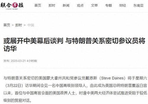 白宫开始为中美高层会晤铺路了?据联合早报报道,这周六,特朗普的亲信、共和党参议员戴恩斯将来华访问,并寻求和中方高层见面。