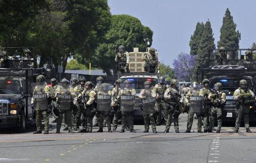 6月6日,美国加州洛杉矶,大批联邦执法人员出现在洛杉矶县多个区域,展开对非法移民的突击搜捕。
