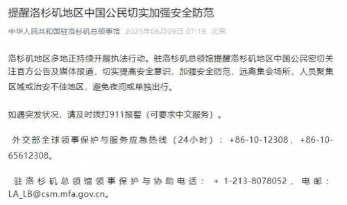 中国驻洛杉矶总领馆立即发表公告提醒洛杉矶地区中国公民密切关注官方公告及媒体报道,切实提高安全意识,加强安全防范,远离集会场所、人员聚集区域或治安不佳地区,避免夜间或单独出行。如遇突发状况,请及时拨打911报警(可要求中文服务)。