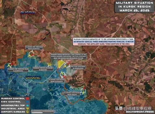 3月26日的战报称,俄军解放了库尔斯克边境的苏贾边检站,完全切断了通往乌克兰苏梅州的战略公路(R-200)。这意味着,被困在库尔斯克突出部苏贾以西地区的数千名乌军,现在已经无路可逃了。据美国方面说法,有两千多名乌军人员被包围在库尔斯克地区。由于大部分入侵乌军部队已经撤回苏梅境内,再加上补给线被俄军切断,该地区的乌军残余力量正在陷入弹尽粮绝的困境。