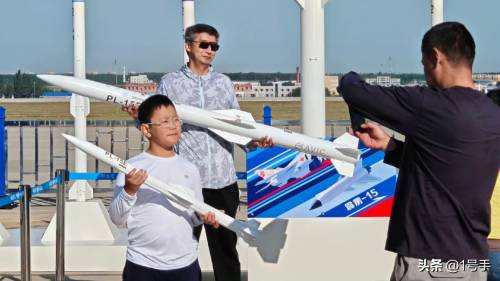 主办方也是有心了,真正抓住了公众的好奇心。pL-15导弹被复刻出各种规格的模型,以此来满足各类观众近距离的体验。比如,大人可以扛起大尺寸的pL-15,小孩可以抱起小尺寸的pL-15,人人有份,触手可摸。