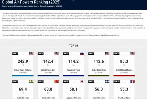 ▲美媒“WDMMA”公布的2025年全球空中力量排名
