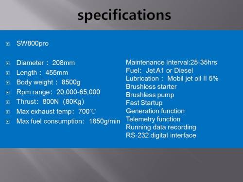 SW800pro重量约为10到15公斤,售价仅1.8万美元。油耗中等(全功率运行下每分钟可消耗2~3升航空煤油),适合短途飞行,使用寿命一般仅为约50~100小时,推力为80公斤级,推重比5:1或者6:1。安装在小型飞行器上,可使得其速度达到大约300~500公里/小时,性能有限。SW800pro曾在2022年的珠海航展上亮相过,是作为中国民用航空动力领域的一个产品被展出的,主要面向的是航模爱好者和小型无人机市场,在美国也能很容易买到。SW800pro作为民用产品,也未列入中国《出口管制清单》,在网上就是现货。如果马赫工业要为展示及专门研发一款动力系统,不仅时间很长,而且很费钱,远不如用现成的来的方便。