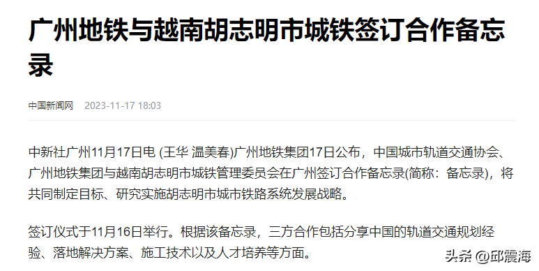近日,中国城市轨道交通协会、广州地铁集团和越南胡志明市城铁管理委员会,于广州签署了一份合作备忘录,将共同制定目标,研究实施胡志明市城市铁路系统发展战略。