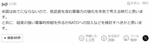 乡民们依然沉浸在“地球我美爹说了算”的框框里。仿佛只要美国同意了,日本就军备自由,加入北约也不是梦了。