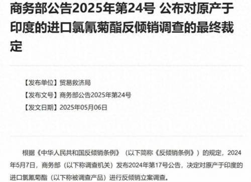 5月7日晚,中国商务部表示:从即日起,对原产自印度的氯氰菊酯产品征收最高166.2%的反倾销税,为期五年。