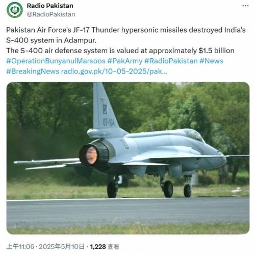 巴基斯坦国家广播电台:高超音速导弹摧毁了S-400防空导弹系统