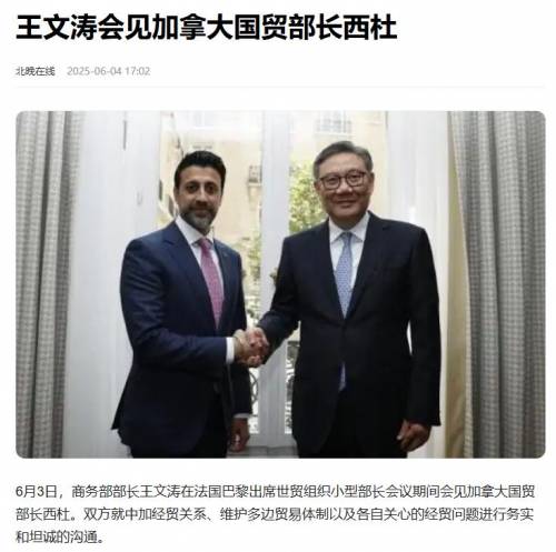 6月3日,加拿大贸易部长西杜与中国商务部长王文涛正式会晤,达成“通过对话解决分歧”的原则共识。