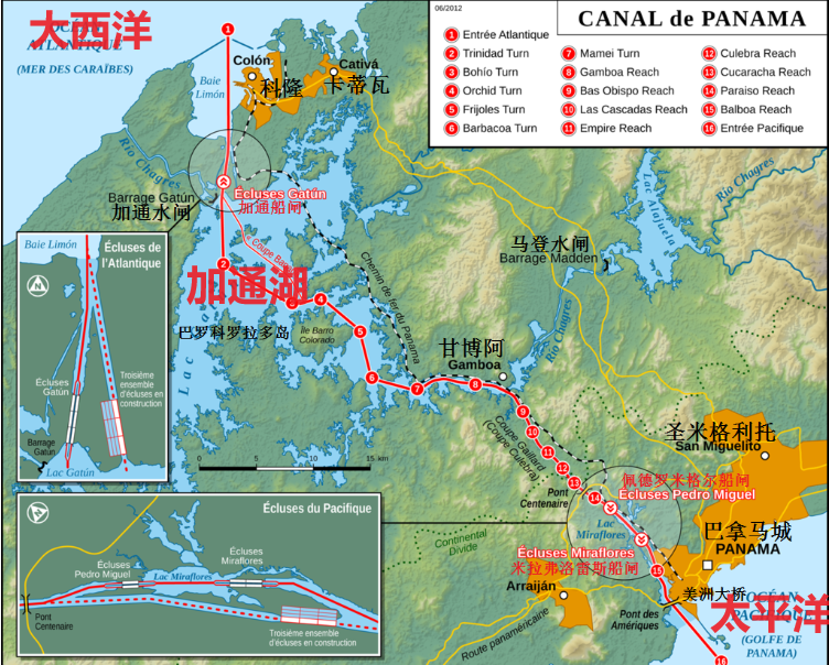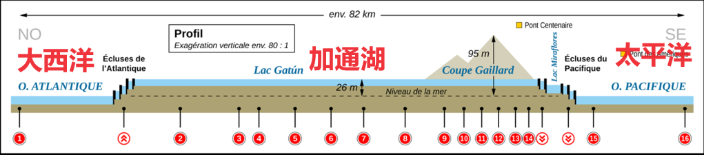 船要通过巴拿马运河,其实是要经过一阶阶船闸,通过放水,不断地把船抬高,等船到中间那个加通湖时,船已经被抬高到海拔25米了!