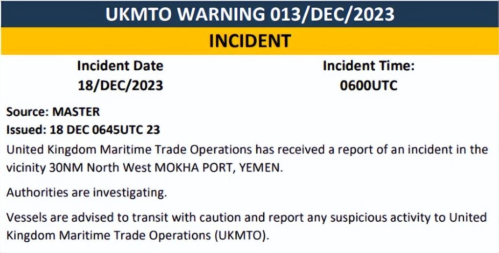 到这里,顺便说一下英国贸易行动办公室,简写是UKMTO,刚发布的一条消息:它接到报告,在也门莫哈港西北 30 海里附近,又出事了!