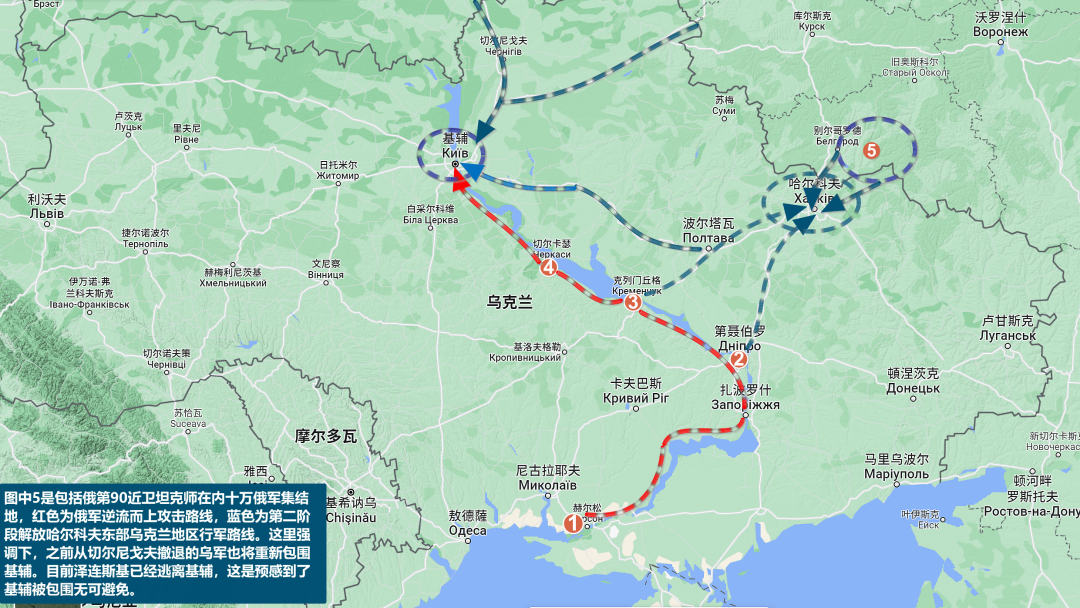 俄军控制第聂伯河东岸地区后,将再次形成对乌克兰西部的虎口战略包抄,如图所示,俄军逆德涅斯特河北上将与白俄罗斯境内15万俄白联军包围乌克兰西部,首都基辅将被俄军重新包围。
