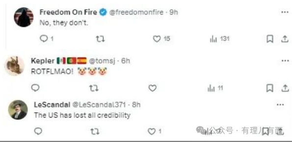 布林肯的言论在社交媒体X平台上引发不少网友吐槽。有网友表示:“不,他们不需要。”“哈哈哈笑死。”“美国已经丧失了所有信誉。”