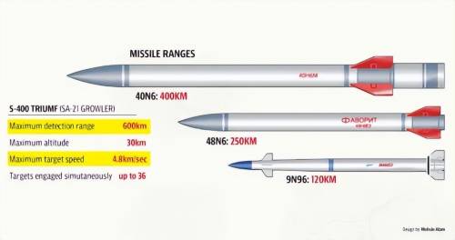 S-400防空系统是第四代综合防空系统,能够使用不同防空导弹,其配备的导弹包括射程380公里的40N6E,射程250公里的48N6E3,射程为120公里的9M96E2,射程为40公里的9M96E。