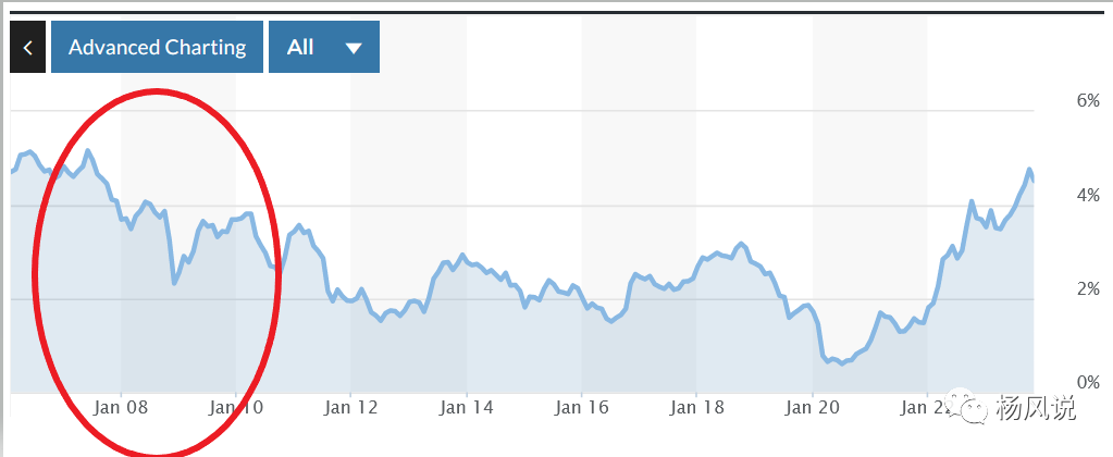 看看2008年的金融危机,被称为金融海啸的危机爆发的时候,美债殖利率持续走低,价格是持续上涨。图表是美国10年期国债的殖利率走势图。