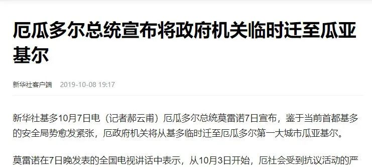 厄瓜多尔政府宣布:政府暂时从首都基多迁出,到另一个城市瓜亚基尔去办公!