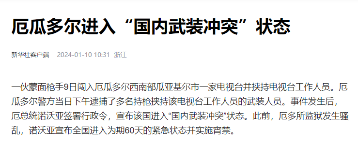 看这条消息:当地时间1月9日,其实相当于我们今天凌晨,厄瓜多尔总统诺沃亚签署行政令,宣布该国进入“国内武装冲突”状态!