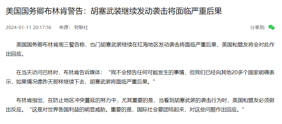 看第一个消息:1月10日,哈马斯方面说,美国国务卿布林肯想要访问加沙,我们拒绝!