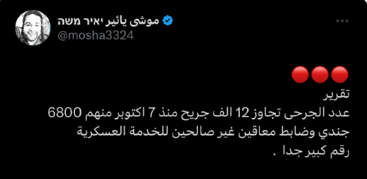 以色列记者摩西亚尔说:根据一份报告,自10月7日以来,以军受伤人数已超过12000人,其中伤残士兵和失去服兵役能力的军官6800人。