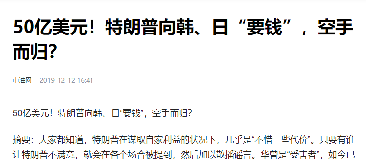 结果特朗普上台后,不知怎么回事,在2018年底,注意到这事了,就跟韩国人讲:这笔钱你们付得实在是太少了,2019年你们要付10亿美元!