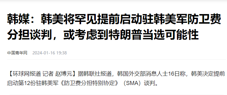 所以马上就出现了这么一条消息:这两天,韩国那边透出消息,说关于驻韩美军,韩国方面的分摊费用,我们要提前和美国人谈判!
