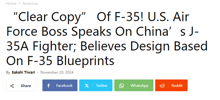 中国第二种隐形战斗机歼-35正式亮相后,五角大楼的心态崩了——美国空军参谋长埃尔文干脆公开质疑“歼-35是抄袭F-35”。但有意思的是,这次居然是诸多外媒主动站出来反驳美军高级将领的这种指责。“保加利亚军事”网站26日更公开讨论“各国会像购买F-35那样排队购买歼-35吗?”