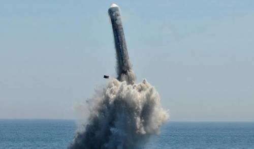 ▲“巨浪-2”潜射核导弹发射后的出水瞬间
