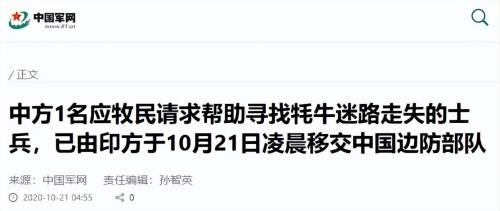 随后在2020年10月18日,环球时报报道在“拉达克”地区,一名帮助牧民寻找牦牛而迷路走失的中国士兵被印方扣留,随后按照协议交还给中国边防部队。